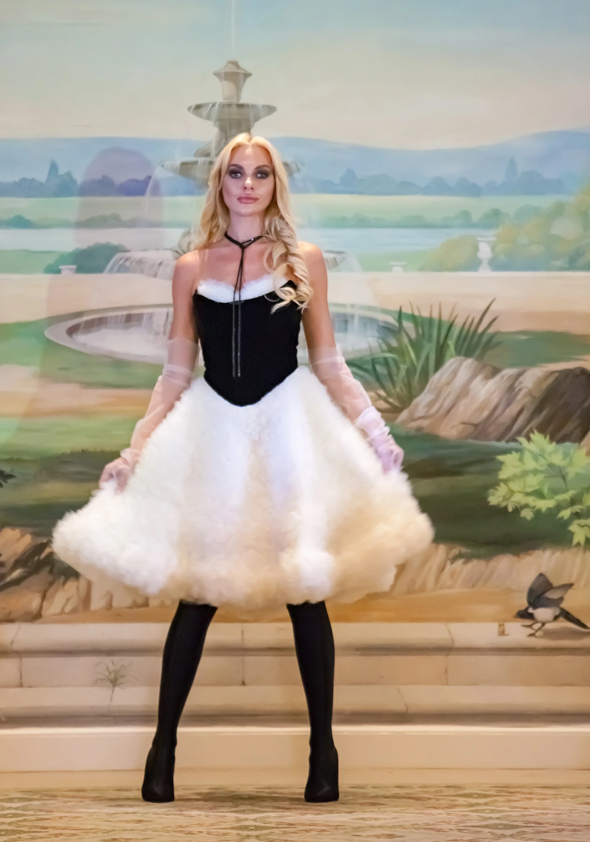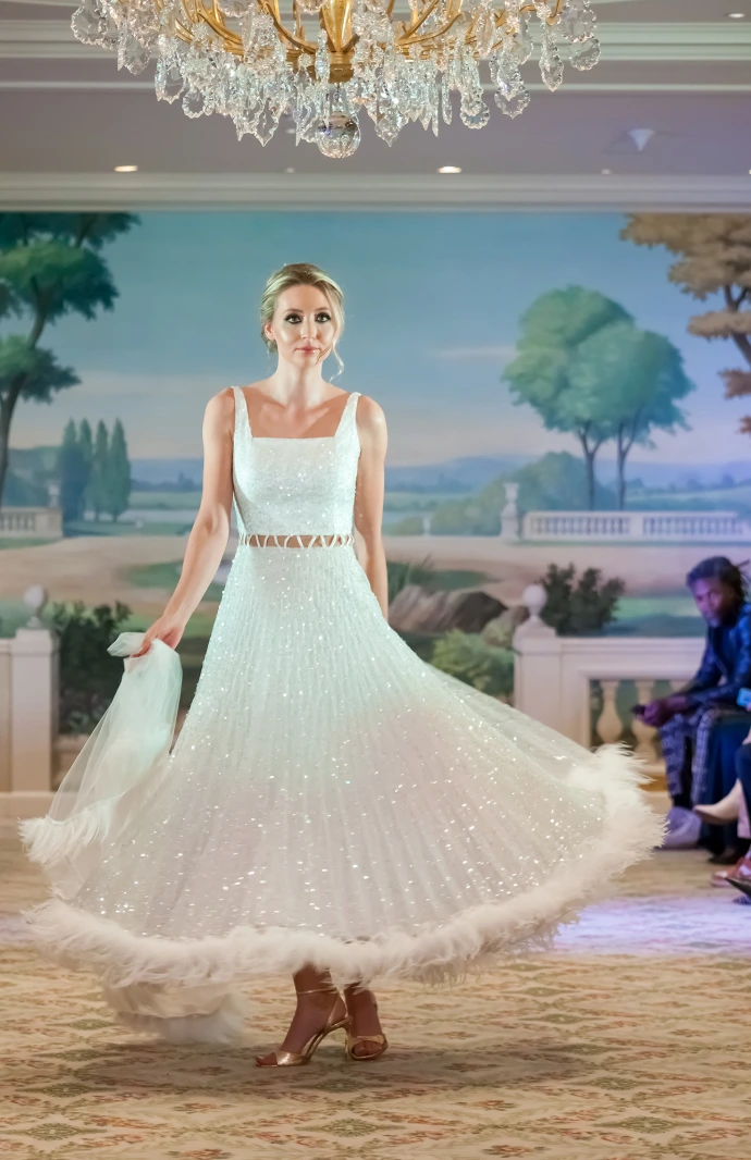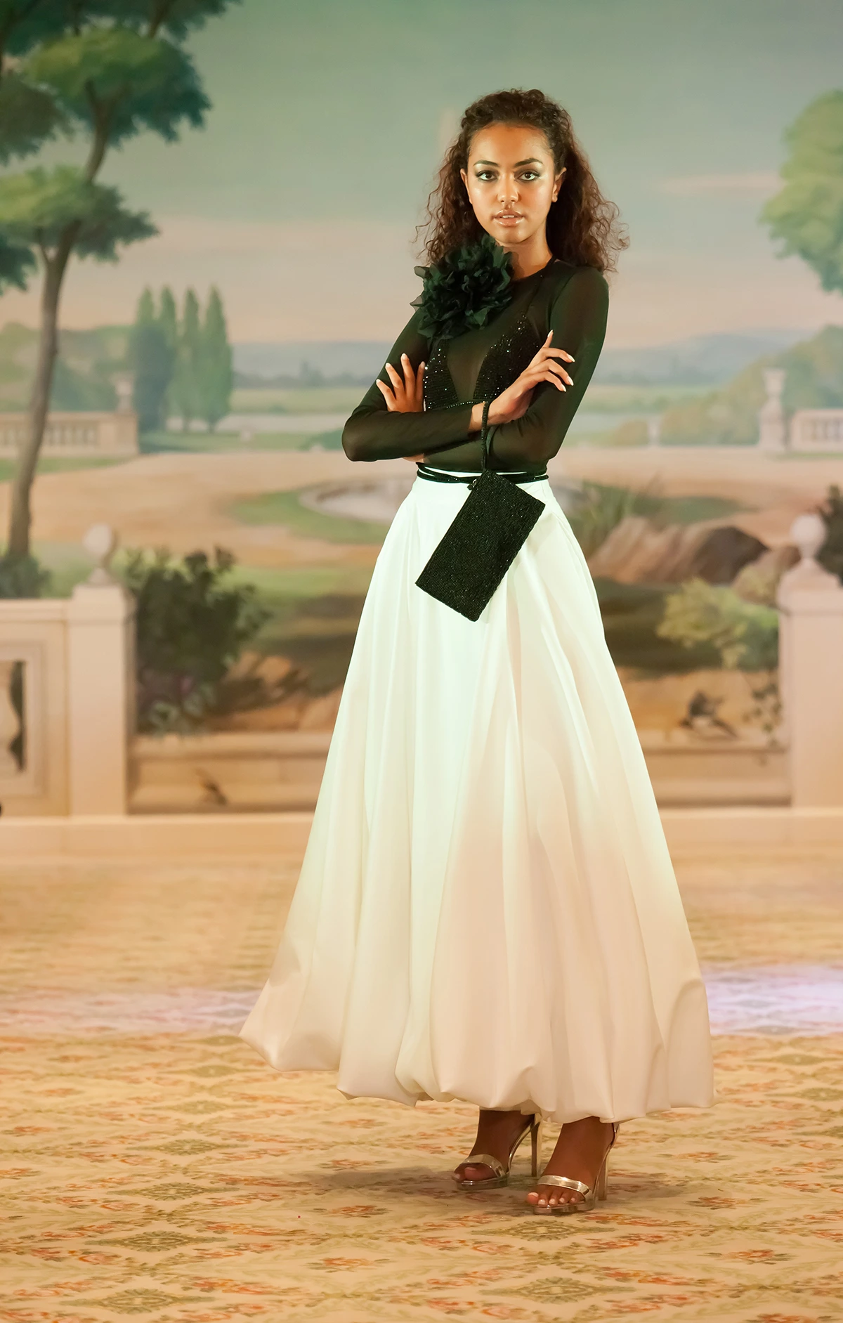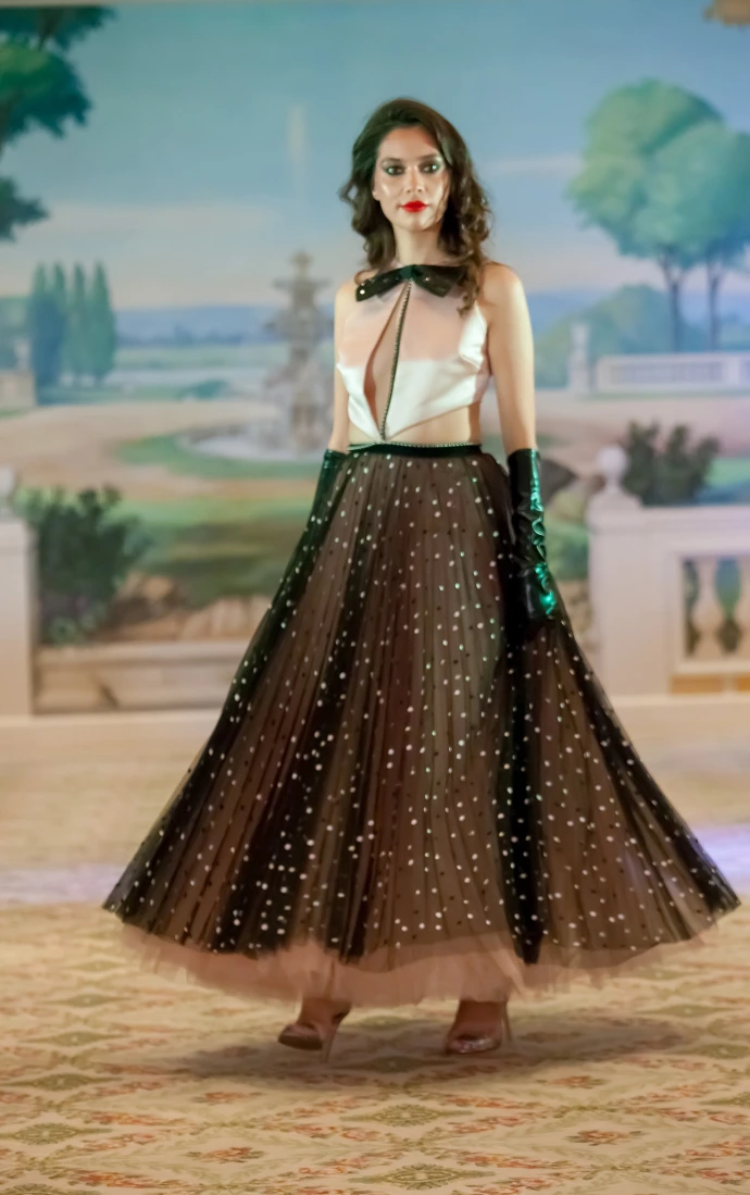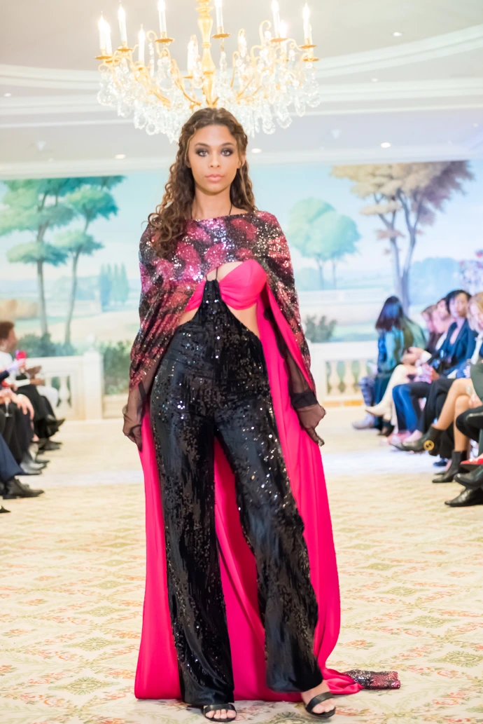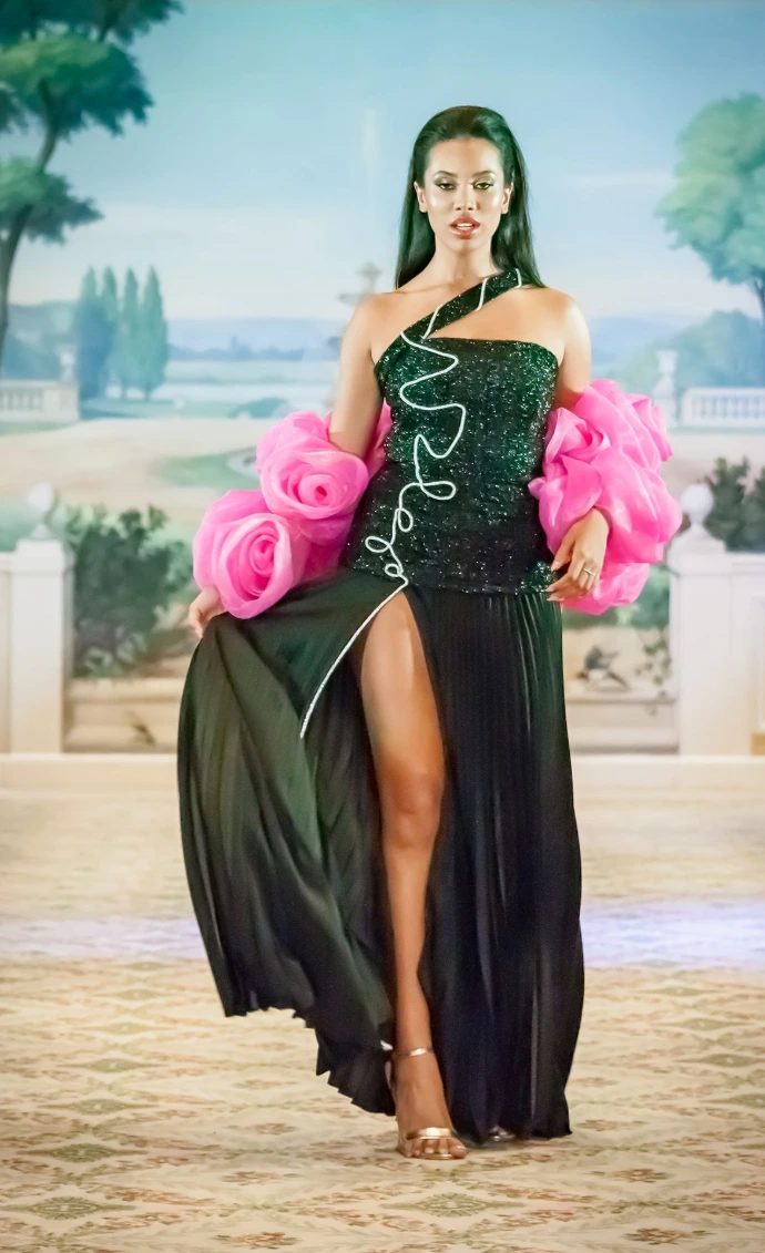The "Jardin de Minuit" collection celebrates a powerful and magnetic femininity through sculptural silhouettes with a strong visual impact. The intense black, enhanced by touches of white and pink, combines with sequins, transparencies and spectacular volumes to affirm a contemporary couture signature. Thought for the international scene, the collection embodies a confident woman, desirable and resolutely iconic.
